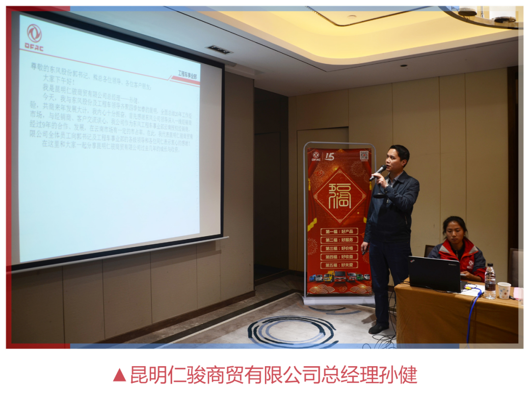 座谈会上,昆明仁骏商贸有限公司总经理孙健对东风汽车股份有限公司和工程车事业部有关领导的来访,以及客户朋友的到来表示热烈的欢迎与衷心的感谢,并与在座嘉宾一起分享了昆明仁骏商贸有限公司近年的成长与收获。