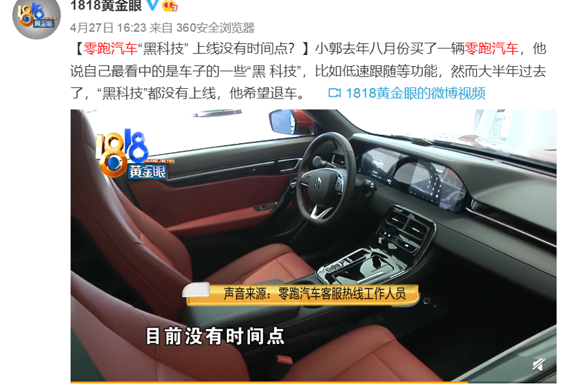 除了以上几点,目前车辆可进行OTA的内容太少,系统未经同意自行升级,宣传噱头过大等也是导致参与者对OTA难言满意的地方。尤其是部分车企对OTA的过度宣传,已经引起了一些消费者的不满。例如零跑汽车就于今年4月被车主控诉买车已有半年,当初宣传的功能仍未上线,并且还无法给出相关功能具体的实现时间,为此这名车主要求退车。