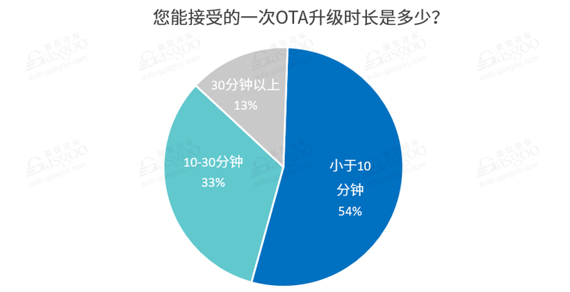 升级时间长也是很多用户对汽车OTA不太满意的一个地方。据此次调查,近90%的参与者所能接受的单次OTA升级时间在30分钟以下,其中33%的参与者所能接受的单次OTA升级时长在10-30分钟之间,基本等同于手机操作系统升级时长,54%的参与者所能接受的单次OTA升级时长小于10分钟,基本等同于手机APP升级时长。目前来看,要达到这些要求显然还需要一定的时间。