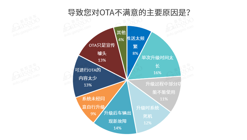 不过认为OTA满意度一般或者不满意的参与者亦不在少数。具体来看,导致用户对OTA不满意的原因主要在于该功能表现不稳定,在升级过程中或者升级后系统存在故障风险。例如菲亚特此前在北美对其最新款Uconnect系统进行OTA后,系统出现故障连续重启,导致车主不仅无法正常使用车载娱乐功能,还失去了紧急救助等关键功能。
