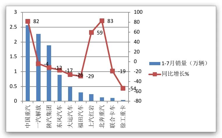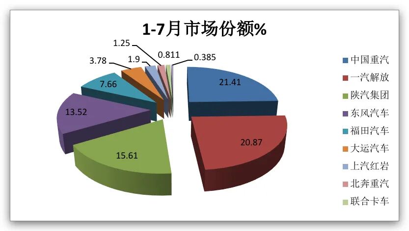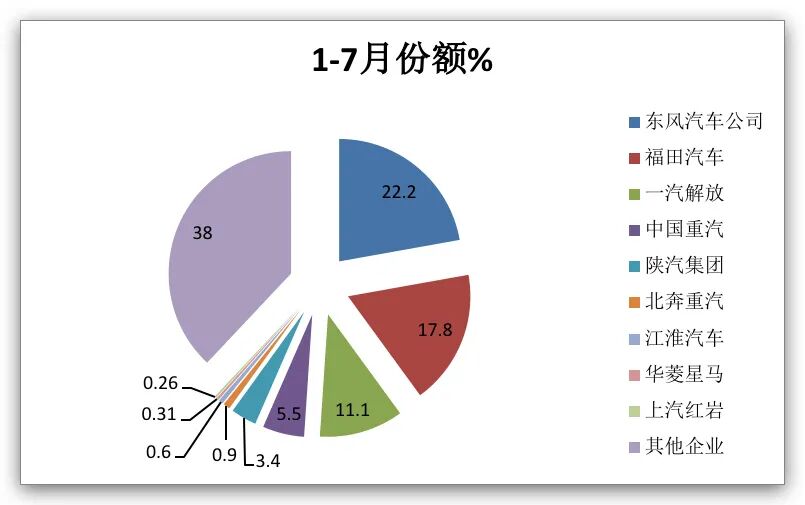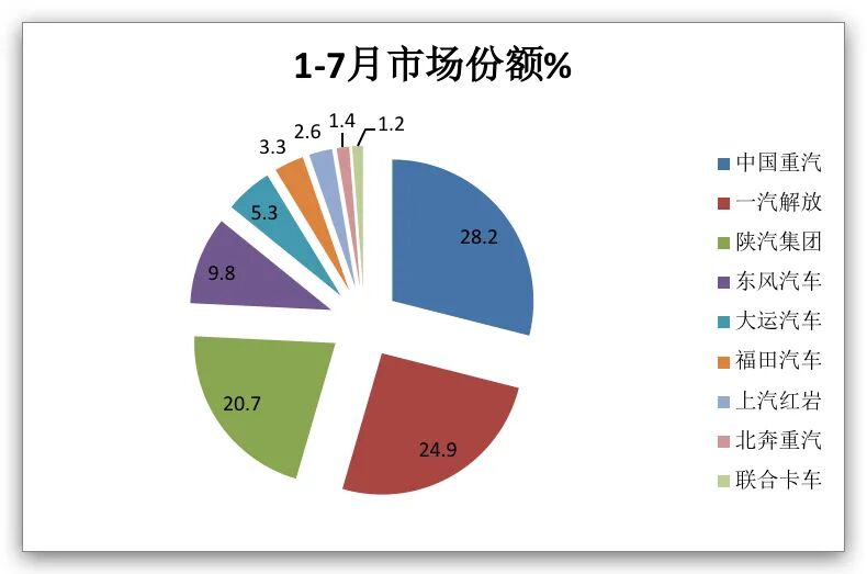 1-7月主流企业重卡销量中,中国重汽占比最大,其次是一汽解放、陕汽集团、东风汽车