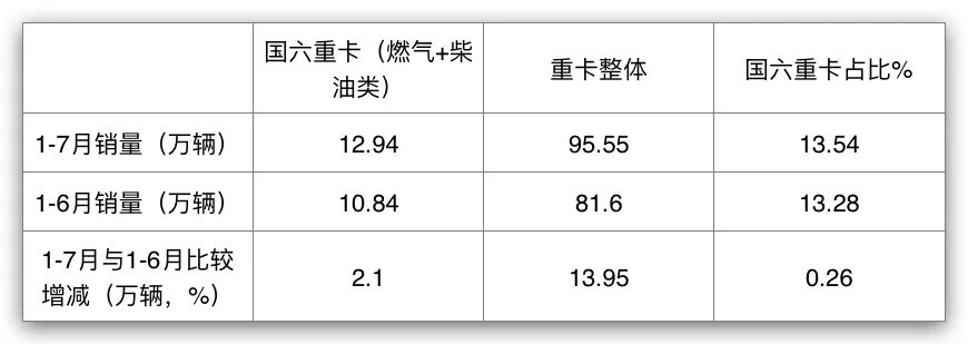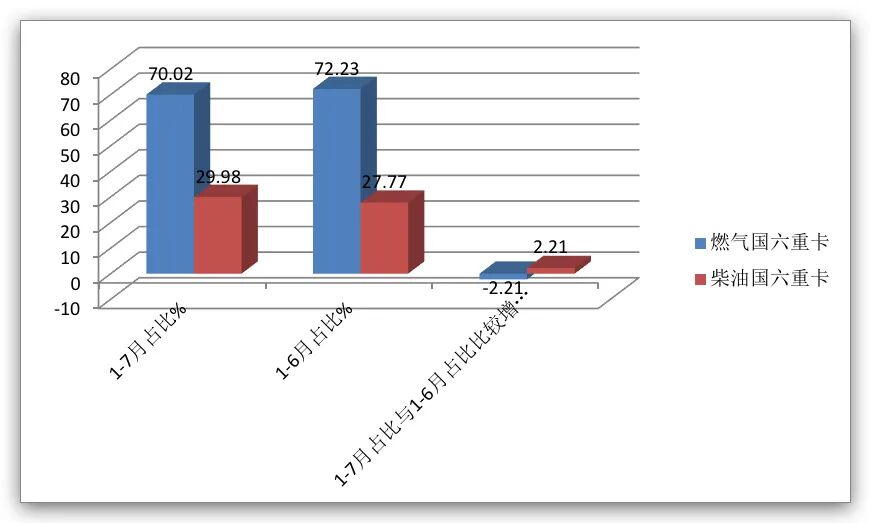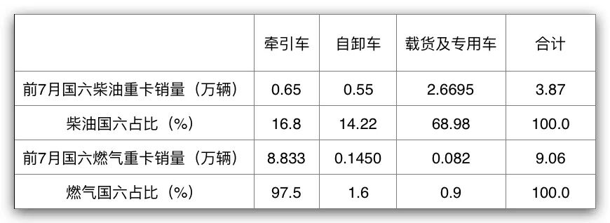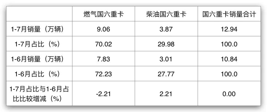 1-7月国六重卡销量中,燃气类占比7成,柴油国六占比继续扩大