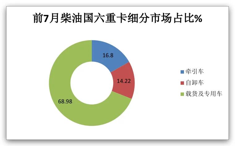 1-7月国六柴油重卡销量中,载货车占比最大,其次是牵引车、自卸车