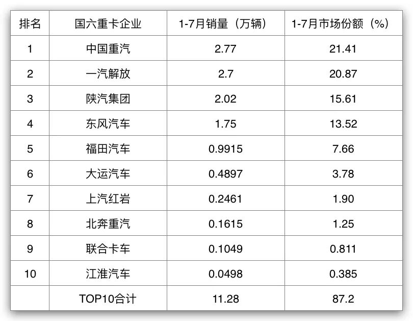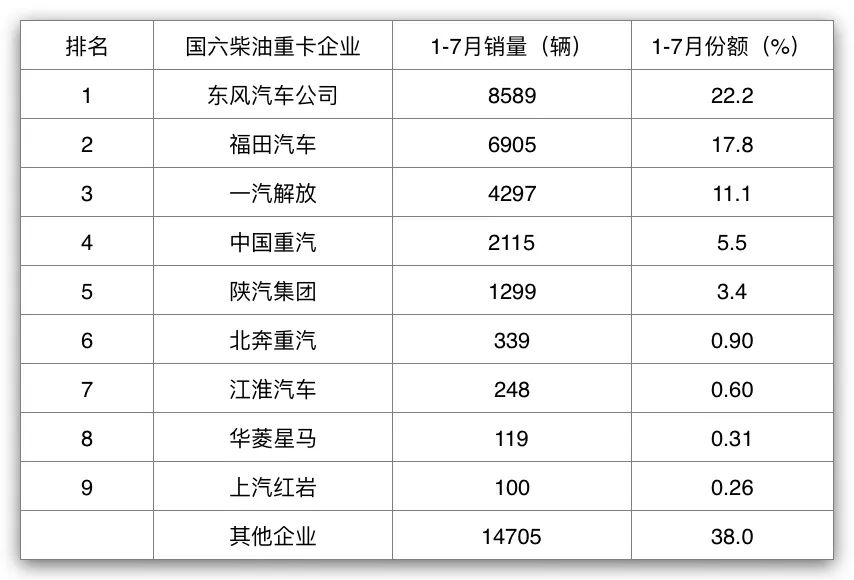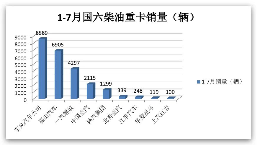 1-7月,东风汽车、福田汽车、一汽解放居柴油国六重卡销量前三