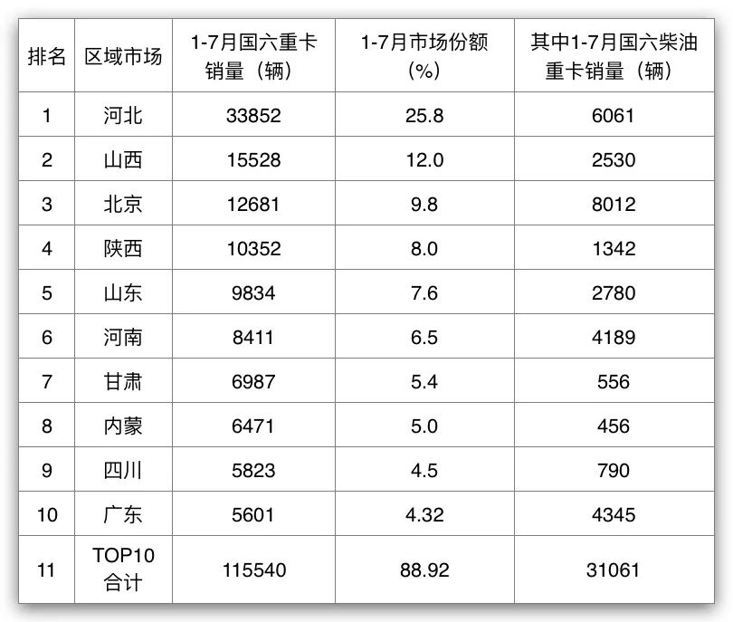 1-7月国六重卡区域分布不均,河北、山西、北京市场份额居冠军前三
