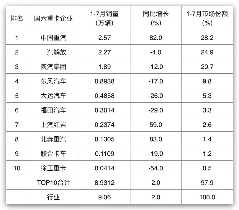 进一步研究发现,前7月国六柴油重卡销量靠前的企业,基本是载货车和专用车的头部企业。也就是说,前7月国六柴油重卡市场销量主要由载货车和专用车贡献。