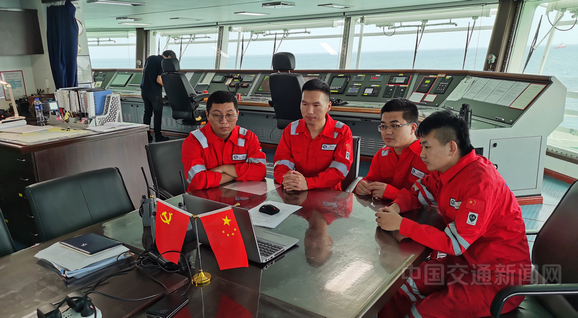 项目组人员在斯里兰卡科隆坡港口外区域作业时收看党的二十大开幕式。