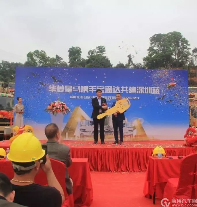 参加本次活动的有宝通达公司董事长罗宝华、宝通达公司总经理周伟雄、深圳市建泰工程公司董事长李海特、深圳市自卸车协会秘书长许凤强、集团公司副总经理何晓生,以及宝通达公司员工等近百名人员。在大家的见证下,何晓生将金钥匙交给宝通达公司董事长罗宝华,百台智能环保渣土车正式交付使用。