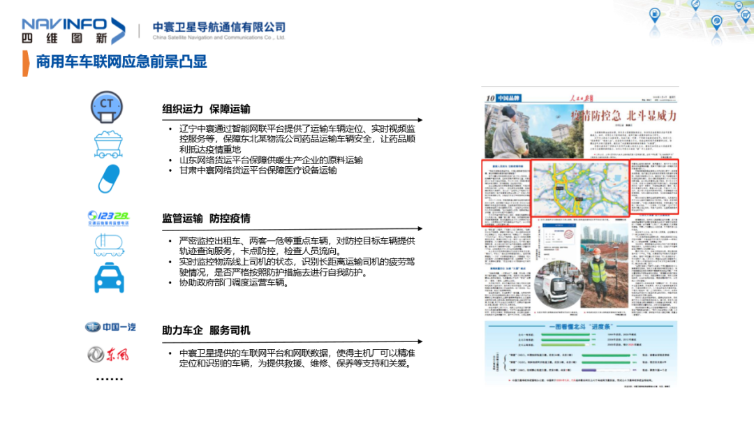 助力车企,通过大数据保障抗疫工作。从火神山、雷神山医院的建设,到防疫、物资的运输、生活、物资运输等一线工作,再到运营车辆进行维保、救援、关爱等服务,中寰都为主机厂提供了车联网技术的支撑。