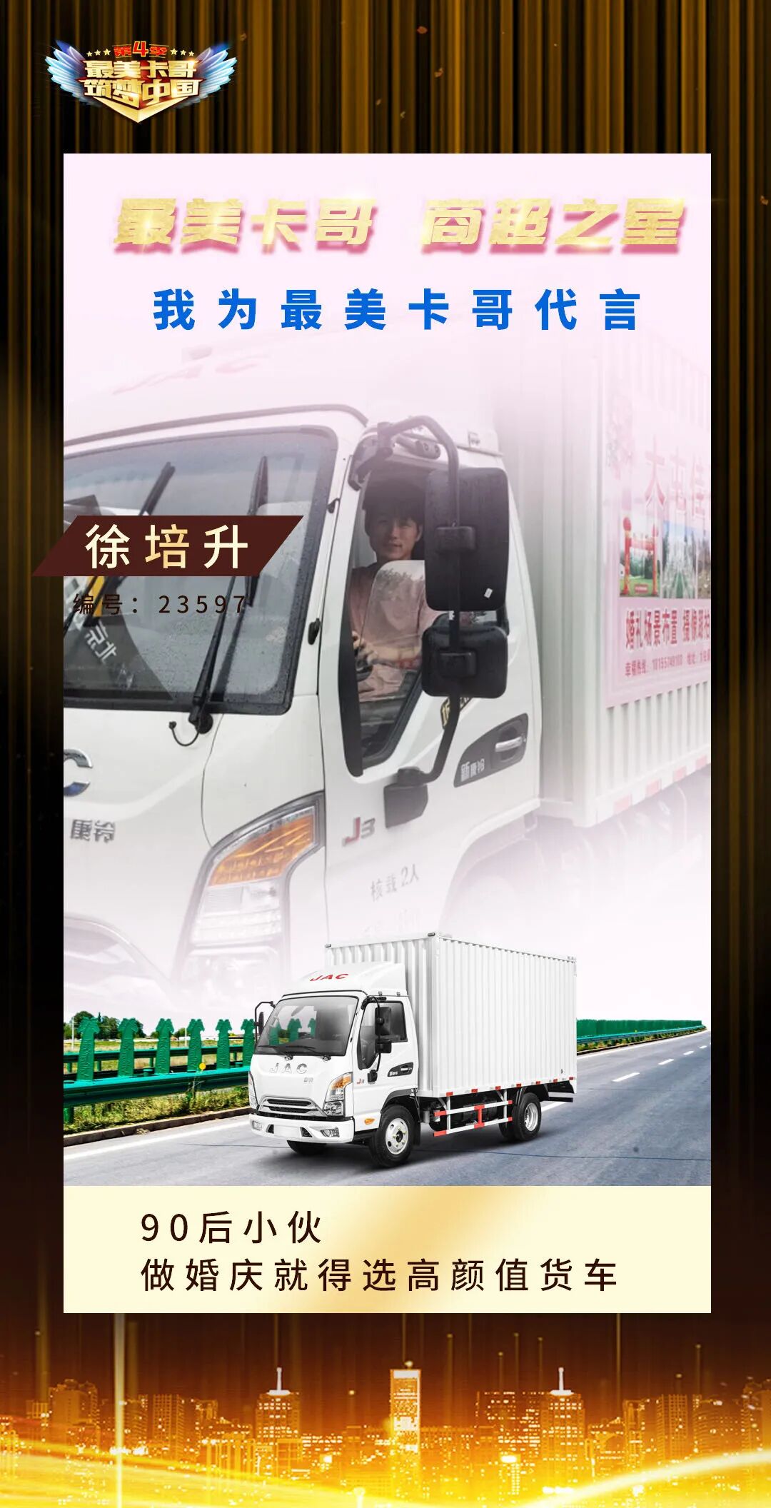 1.微信搜索“江淮轻卡”并关注,点击公众号底部菜单“我的礼遇”→“最美卡哥”即可参与 2.回复“最美卡哥”,点击弹出链接即可参