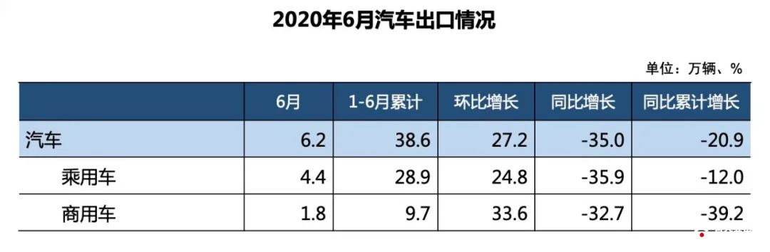 根据中汽协会提供的数据,2020年6月,汽车整车出口6.2万辆,环比增长27.2%,同比下降35%。1-6月,汽车整车累计出口38.6万辆,同比下降20.9%。