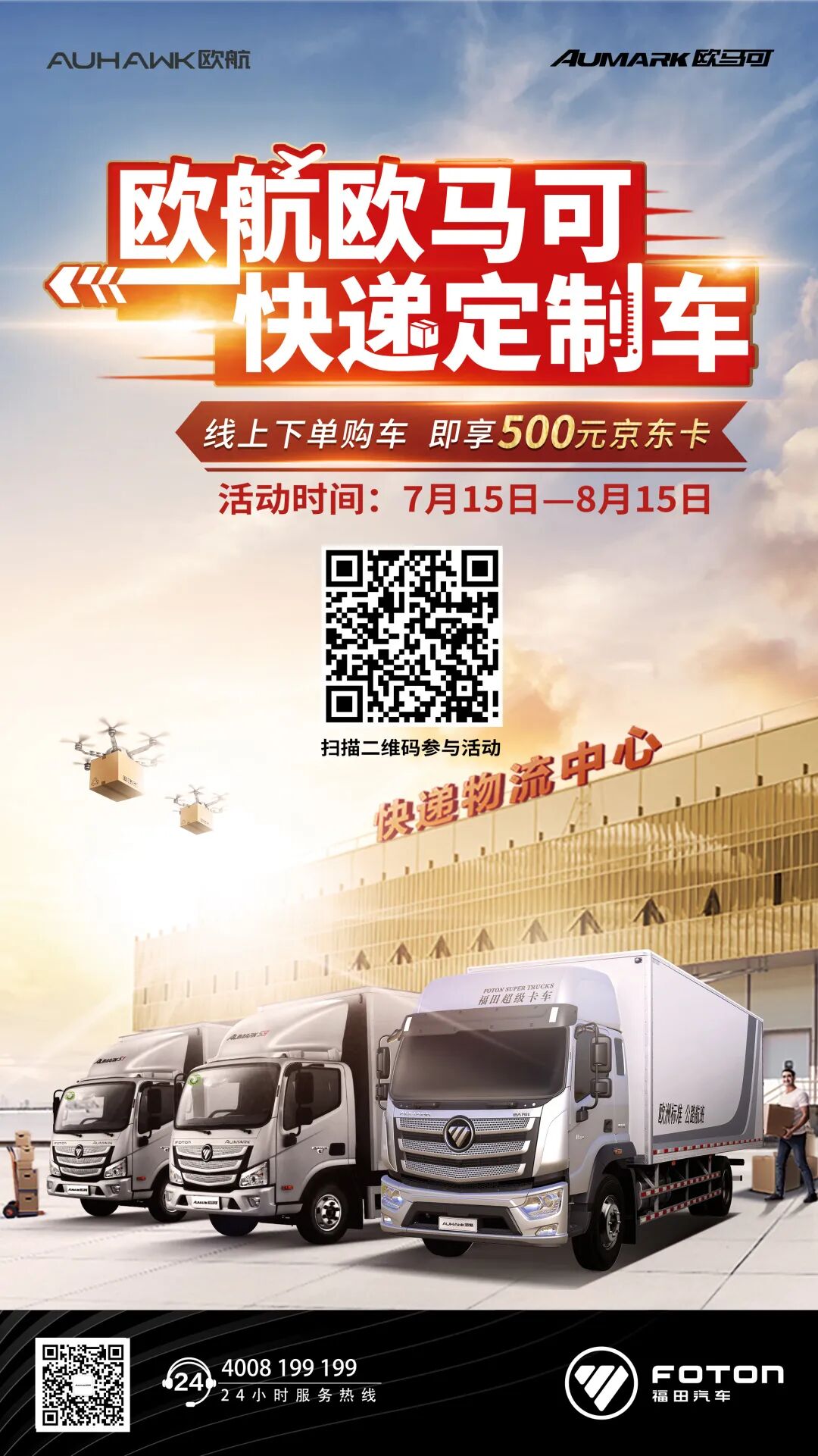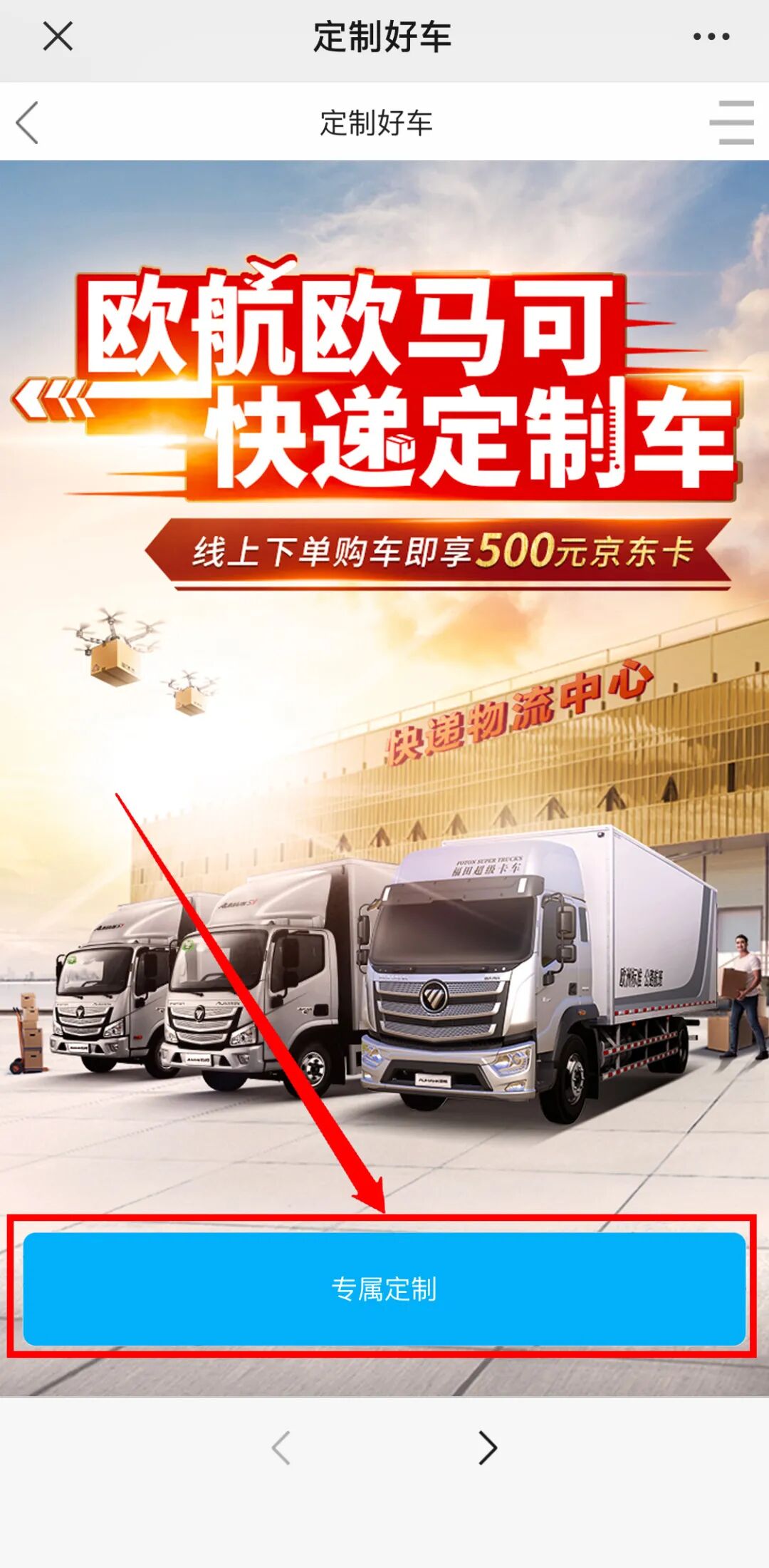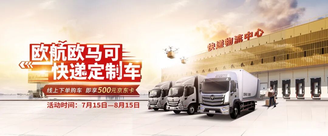 送福利!送福利!送福利! 重要的事情就要大声说出来! 购欧航欧马可快递定制车享专属福利 线上下单 即享500元京东卡 活动说明 1:活动时间:2020年7月15日—8月15日; 2:本次活动奖励核算方式以车辆实销时间为准; 3:奖品有限,先到先得,每人只能领取一次。 参与方式 扫描文中二维码参与。 一、活动参与流程 1、进入活动页面后,点击底部专属定制按钮,进入选择场景页。 2、选择适应您的运输场景。 3、选择您工作的物流企业类型。 4、选择您所需车辆的排放标准。 5、选择您要订购的车型。 6、选好后点击右下角的立即订购按钮。 7、登录您的福田会员账号。 8、登录后完善购车信息,并支付19.9元定金,即可完成订购。 老司机们还在等什么~ 快来参与活动 领取你的专属快递定制车 开启高效运输新生活