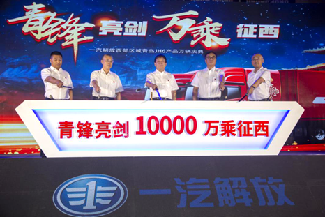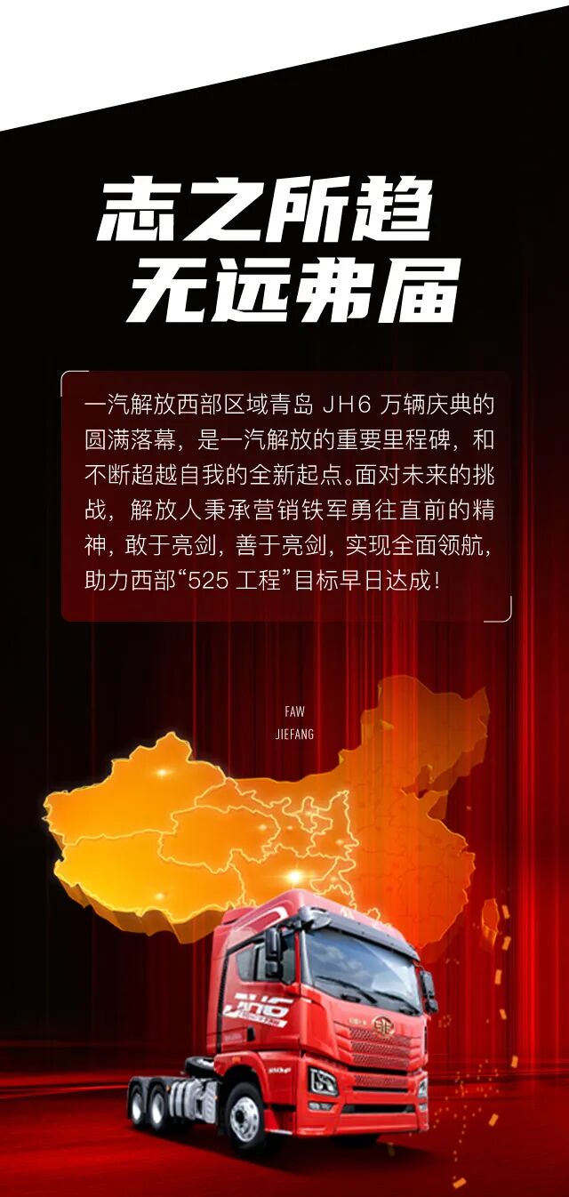 在现场嘉宾见证下,大屏幕播放了西部区域JH6产品万辆回顾视频,再次重温了一汽解放半年来于西部区域的历程累积;展示了长春、青岛双基地双核驱动的布局优势,以及万辆冲锋团担负使命、势如破竹,采用产品覆盖度提升,强化网络管理,推行可视化项目,提升服务保障等措施,共同铸就JH6万辆达成的荣耀里程。