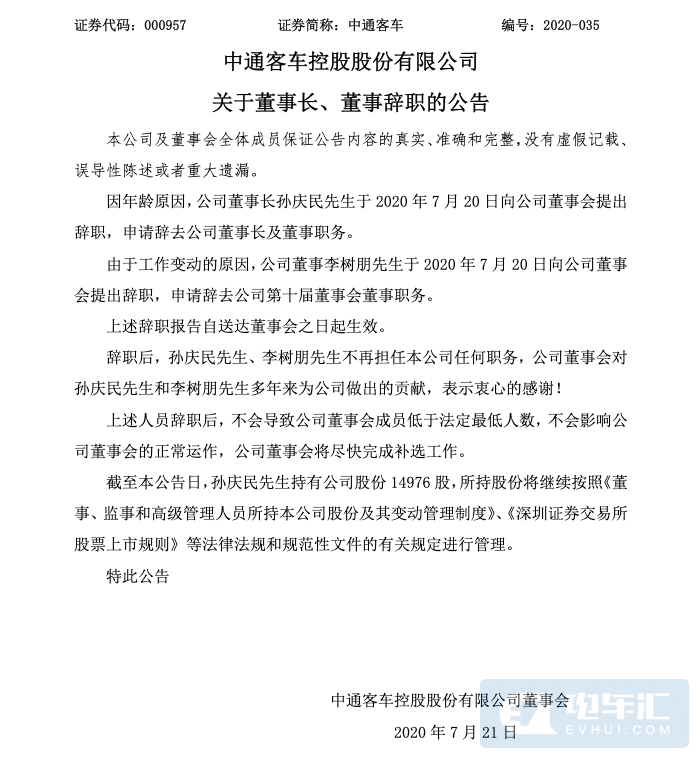 7月21日,中通客车发布关于董事长、董事和高级管理人员辞职的公告。因年龄原因,公司董事长孙庆民于2020年7月20日向公司董事会提出辞职,申请辞去公司董事长及董事职务。由于工作变动的原因,公司董事李树朋、副总经理贾开潜、王传甫于2020年7月20日向公司董事会提出辞职,申请辞去公司第十届董事会董事职务。