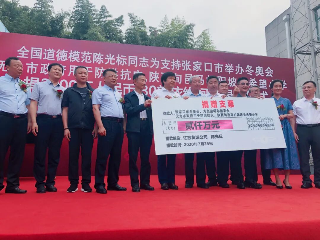 7月25日下午,全国道德模范陈光标同志为张家口市冬奥会、为奥运喝彩组委会、无为市政府用于防洪抗灾、陕西旬邑马兰阳坡头希望小学捐款2000万人民币及30辆依维柯欧胜。