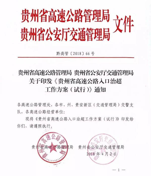 2018年4月2日贵州省高速公路管理局 贵州省公安厅交通管理局关于印发《贵州省高速公路入口治超工作方案(试行)》的通知 (黔高管〔2018〕66号),该文件主要内容有以下几个方面: