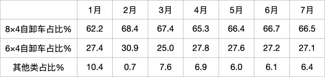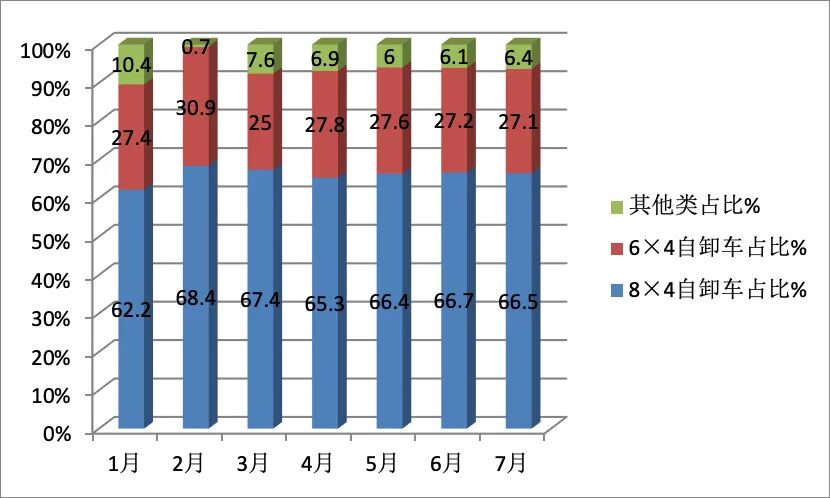 按驱动形式划分,1-7月中重型自卸车主销车型为8×4,其次为6×4车型