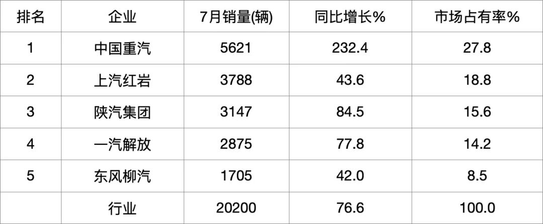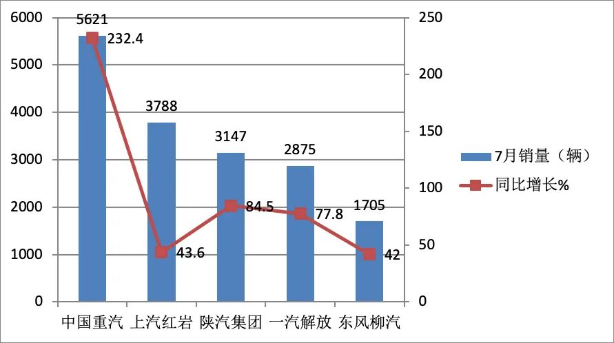 7月自卸车TOP5中,重汽暴涨居销量冠军;红岩、陕汽、解放、东风柳汽次之