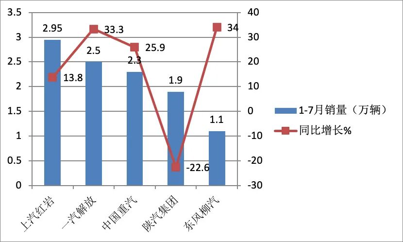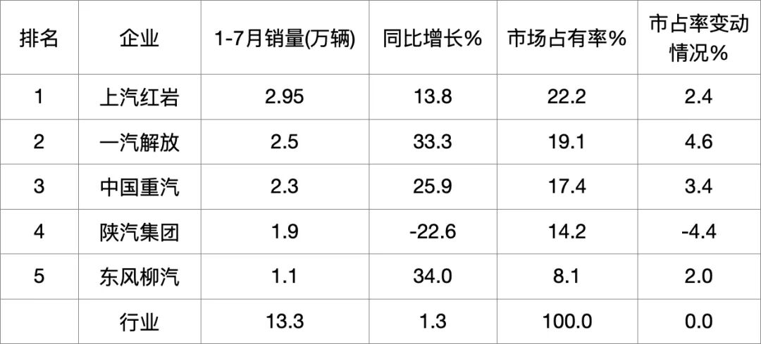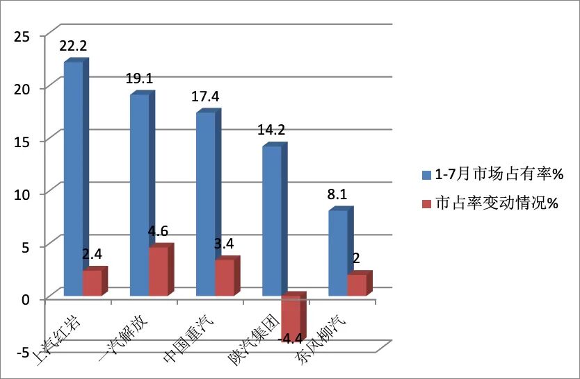 1-7月主流企业竞争格局中,红岩占比超2成,位居第一;解放、重汽、陕汽及东风柳汽次之