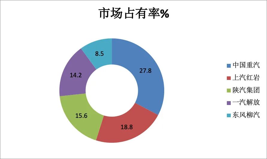 从以上图表可见,2020年7月,自卸车主流企业T0P5中,重汽销售5621辆,市场份额27.8%,位居冠军;上汽红岩销售3788辆,市场份额18.8%,位居亚军;陕汽集团销售3147辆,市场份额15.6%,位居季军;一汽解放销售2875辆,市场份额14.2%,位居第四;东风柳汽销售1705辆,市场份额8.5,位列第五。