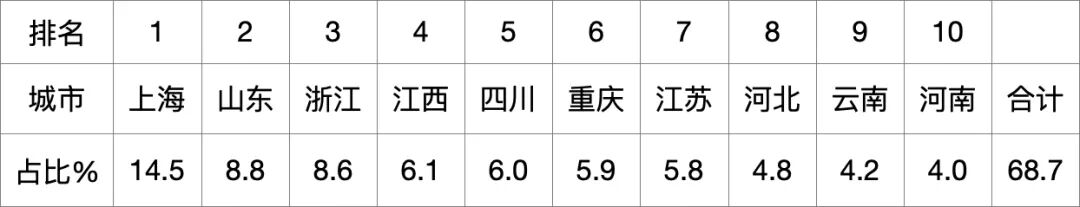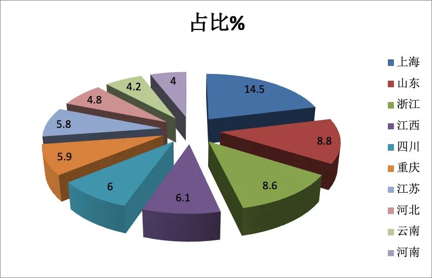 可见,在2020年1-7月TOP10的自卸车流向中,区域分布不均,上海拔得头筹,占比14.5%;山东、浙江分别位居第二和第三占比分别为8.8%和8.6%;TOP10区域累计占比近7成(67.8%)。