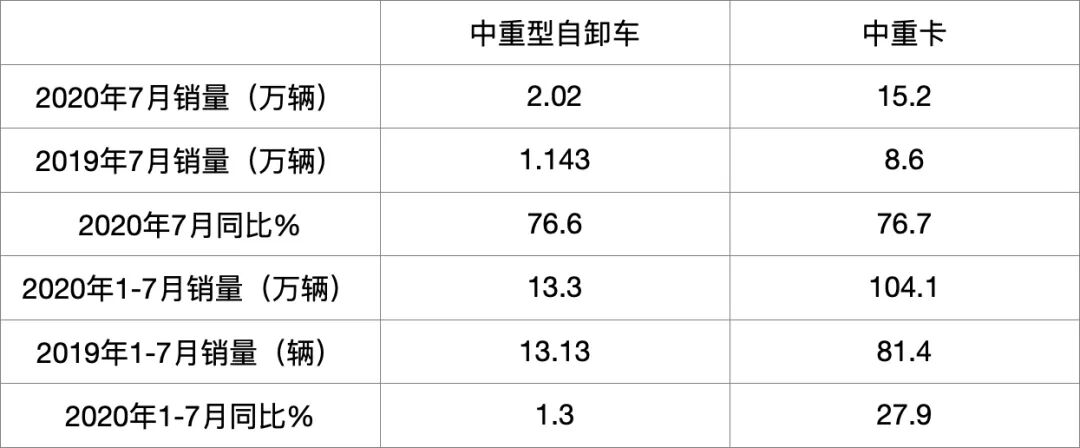 从表中可知,2020年7月,作为中重卡细分市场的中重型自卸销量同比增长76.6%,中重卡销量同比增长76.7%,二者几乎“同步”增长。