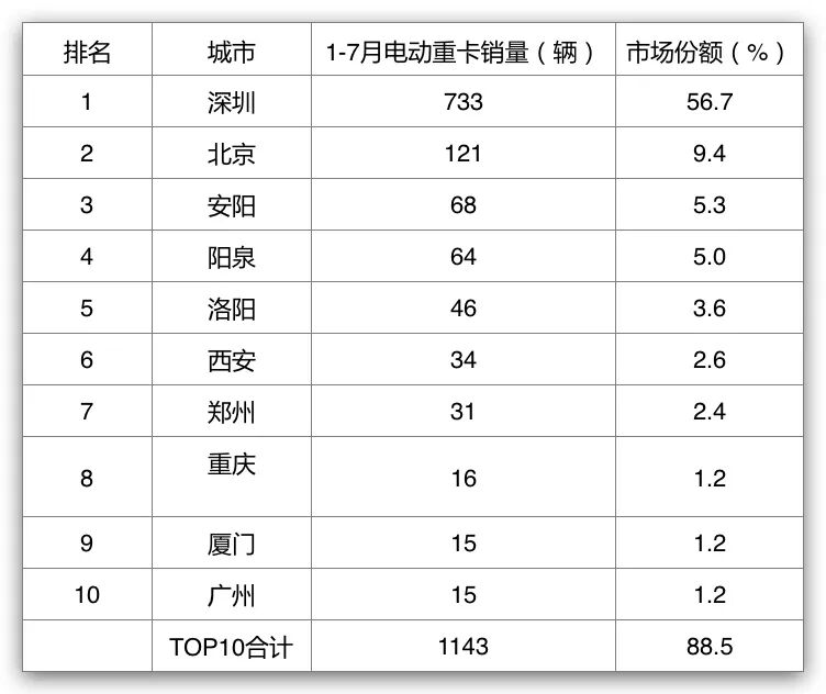 从前7月电动重卡区域流向看,深圳一家独大,占比近6成