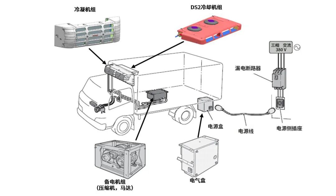 带备电式冷冻机,是指在非独立式冷冻机上加装一套备电机组的制冷系统。相对于车辆发动机驱动压缩机的主运转系统来说,备电系统是通过三相交流马达来驱动压缩机运转进行制冷的系统。