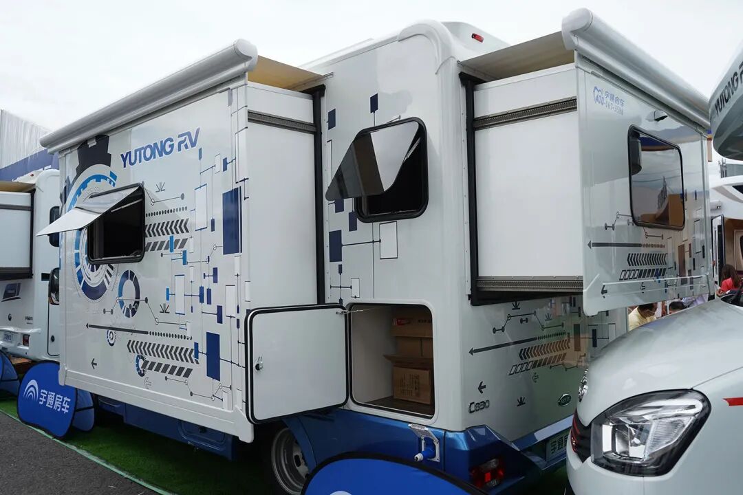 宇通展位的这台C630尊享版国五房车除了底盘配置不同之外,在车身上还点缀了众多智能科技元素图案。