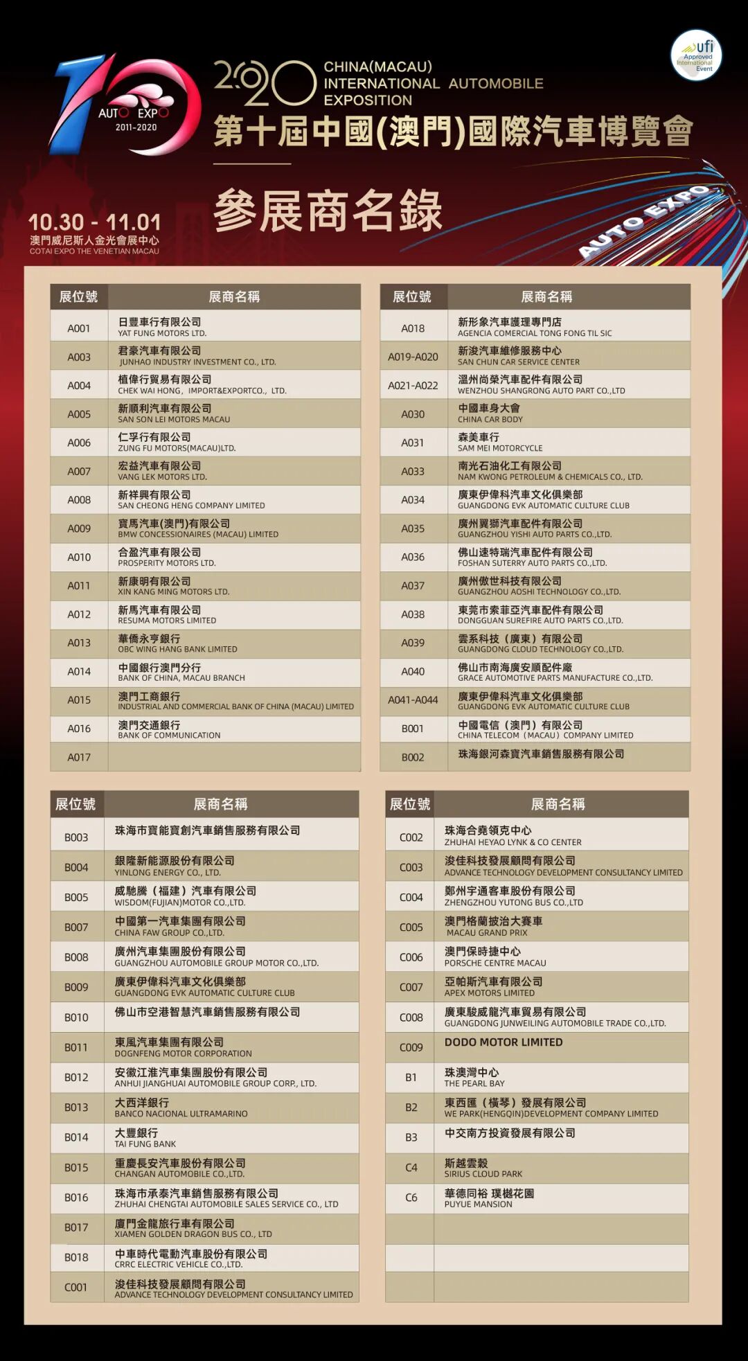 第十屆中國(澳門)國際汽車博覽會將於2020年10月30日-11月1日隆重舉行,我們在澳門威尼斯人金光會展中心期待您的蒞臨!