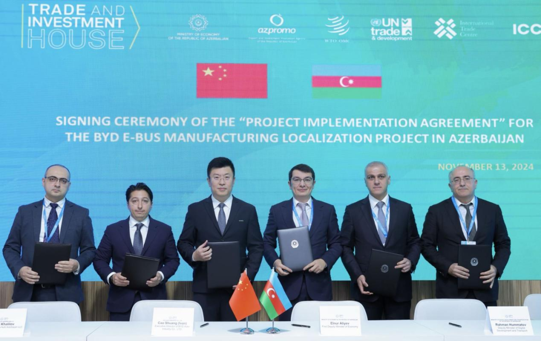 11月13日,在COP29主会场绿区新闻中心,比亚迪与阿塞拜疆政府签署电动大巴项目实施协议。据协议,比亚迪将在该国苏姆盖特工业园区建立先进的商用车制造基地,预计在2025年至2028年期间,每年生产约200辆电动大巴。